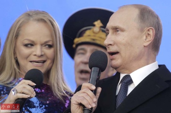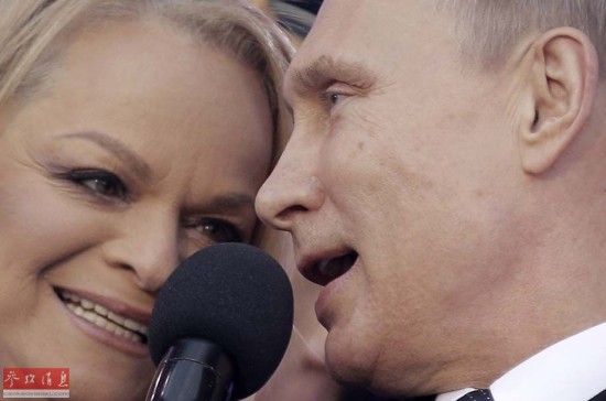 2015年3月18日,在活动期间,俄罗斯总统普京(右)与俄罗斯著名歌手拉莉莎·多林娜(Larisa Dolina)一同演唱俄罗斯国歌,庆祝克里米亚入俄一周年。