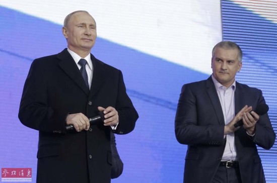 2015年3月18日,俄罗斯总统普京(左)与克里米亚总理谢尔盖·阿克肖诺夫共同出席当天的庆祝活动。