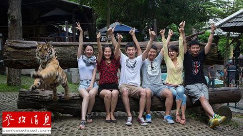 中国游客在泰国清迈湄林县的“老虎王国”与老虎合影(美国消费者新闻与商业频道网站)