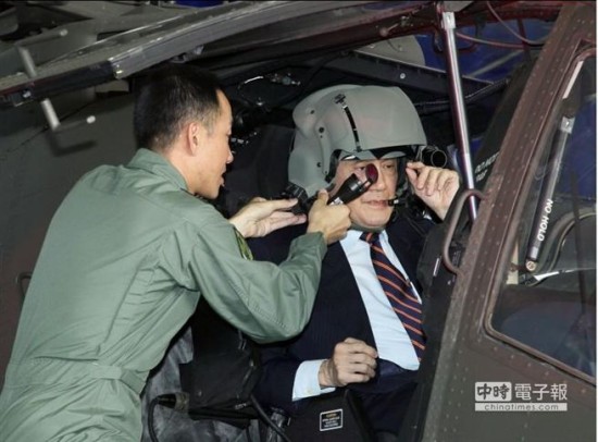 马英九戴上价值近新台币200万的飞行头盔竖起大姆指赞许阿帕奇性能优越。
