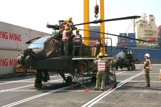 10月20日在码头卸货的第5批阿帕奇直升机。