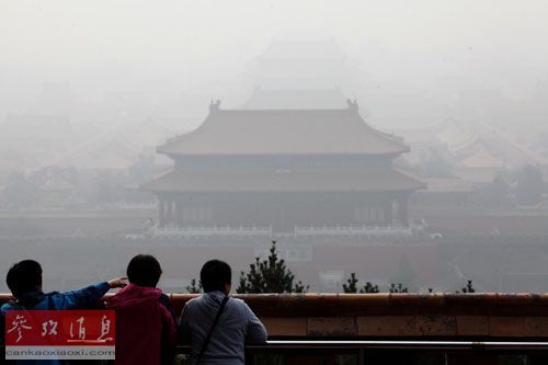 资料图:10月25日,游人在雾霾笼罩的北京景山上眺望故宫。新华社发(王希宝 摄)