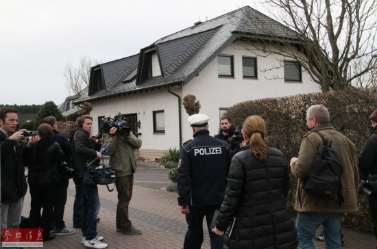 3月26日,警察在德国蒙塔鲍尔的一座房屋附近警戒。该房屋据信属于坠毁客机副驾驶员安德烈亚斯·卢比茨。法国检察部门官员3月26日说,德国之翼客机坠机时,副驾驶员单独待在驾驶舱里,是他启动了客机降落过程,可以认为副驾驶员具有故意摧毁飞机的意图。新华社/美联