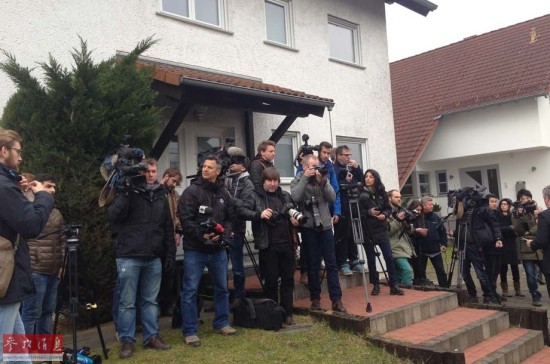 3月26日,在德国莱茵兰-普法尔茨州蒙塔鲍尔市,媒体记者聚集在德国之翼失事客机副驾驶安德烈亚斯·卢比茨的住所附近(手机拍摄)。当天,德国警方已启动调查程序,对德国之翼失事客机副驾驶安德烈亚斯·卢比茨位于莱茵兰-普法尔茨州蒙塔鲍尔市的家进行搜查。新华社发(申正宁摄)