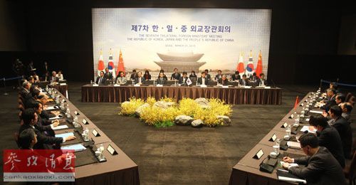 这是3月21日在韩国首尔拍摄的第七次中日韩外长会现场。新华社记者姚琪琳摄
