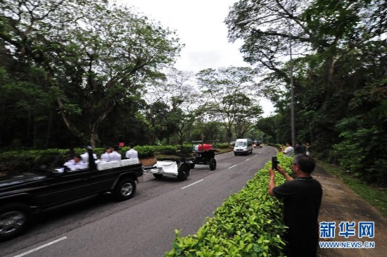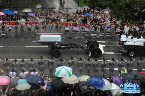 路透社新加坡3月29日报道说,李光耀的移灵队伍29日蜿蜒穿过新加坡市区,成千上万人冒着大雨排在街道两旁,目送开国总理最后一程。