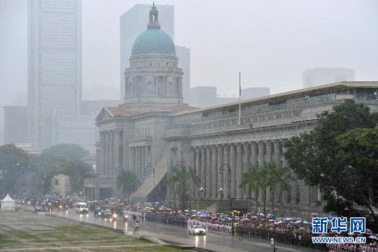 3月29日,在新加坡政府大厦前,民众冒雨目送新加坡前总理李光耀的灵柩。当日,新加坡建国总理李光耀的国葬仪式在新加坡国立大学文化中心举行。 新华社发(邓智炜摄)