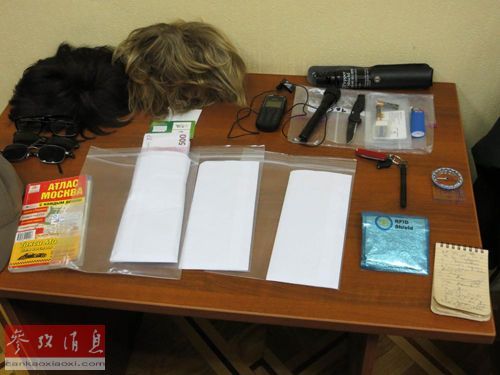 资料图片:俄方展示据称是中情局间谍的随身物品,包括假发、现金及文件等。
