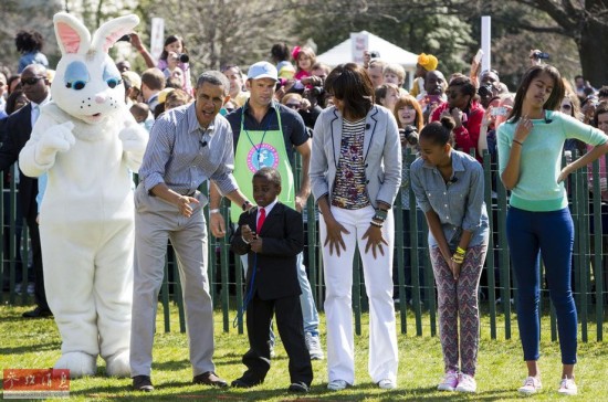 2013年4月1日,美国华盛顿,“儿童总统”和总统奥巴马一家参加白宫举行的“复活节捡彩蛋”活动。当天是愚人节,一向严肃的白宫也“恶搞”了一把。白宫先在官方推特上留言:“上午十点,白宫将发布一段来自总统的视频。”正当人们纷传总统奥巴马要讲什么时,风靡美国的童星“儿童总统”出现在白宫新闻发布厅,原来是此“总统”非彼总统。