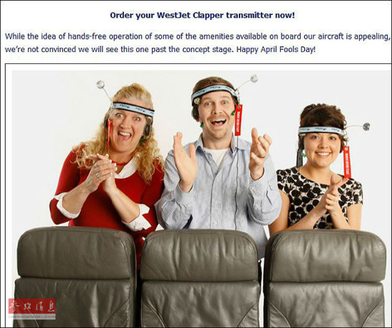2010年愚人节,西捷航空(WestJet)在其官网发布广告称,他们将为乘客提供一项新的服务。这项服务可以让乘客只需要拍手就可以控制灯光,椅背电视等。