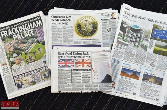西方媒体是不会放过愚人节这一天的。2014年4月1日,英国伦敦,愚人节当天的报纸修改了硬币和国旗图案。