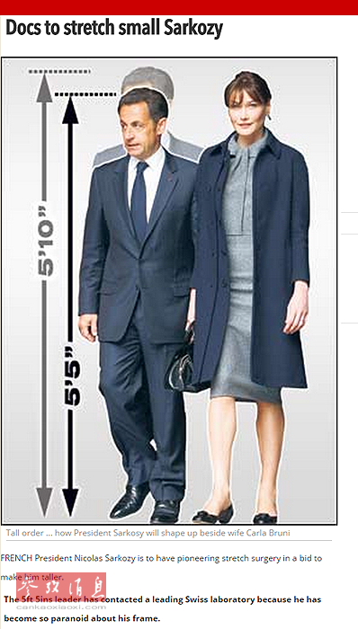 2008年4月1日,英国《太阳报》 “恶搞”法国总统尼古拉·萨科齐,称萨科齐要做增高手术。萨科齐夫妇上周访问英国期间,萨科齐脚蹬增高鞋,他的夫人、前超级名模卡拉·布吕尼脚穿平底鞋。这一细节曾为英国媒体津津乐道。《太阳报》的这篇报道以《医生要拉长萨科齐》作标题,称萨科齐将接受一项尖端前卫的手术,以增加身高。报道援引法国政府发言人“吕克·比格”的话说:“病人在牵引床上接受数小时牵引后,医生把钙质物质注射到病人关节附近的骨干中。”报道称,瑞士一家实验室的医生将为萨科齐实施手术。医生认为,萨科齐的身高可在一年后“令人惊讶地”增加12.7厘米;全部疗程结束后,萨科齐将比布吕尼高出2.54厘米。为让读者相信报道属实,报纸配发了萨科齐夫妇并肩行走的照片,标出增高前和增高后二人的身高差距,还以图表形式介绍治疗过程和原理。