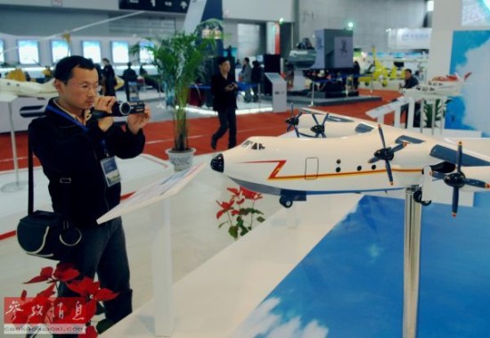 航空爱好者在航空设备器材展中航工业通飞展区拍摄蛟龙600水陆两栖飞机模型。新华社记者 李一博 摄