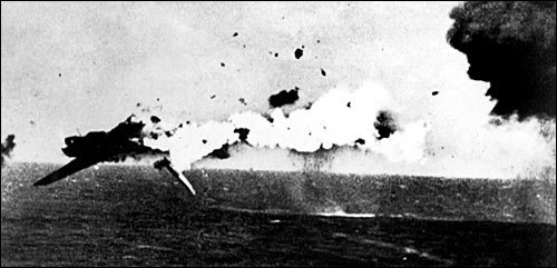 资料图片:冲绳战役期间,被美军防空火力击毁的神风自杀攻击机。(图片来源于网络)