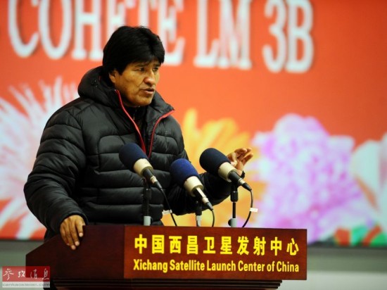 12月21日,卫星发射成功后,玻利维亚总统莫拉莱斯在西昌卫星发射中心发表讲话。新华社记者 燕雁 摄