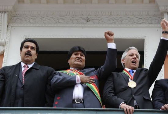 资料图片:玻利维亚总统莫拉莱斯(中)与副总统加西亚(右)。