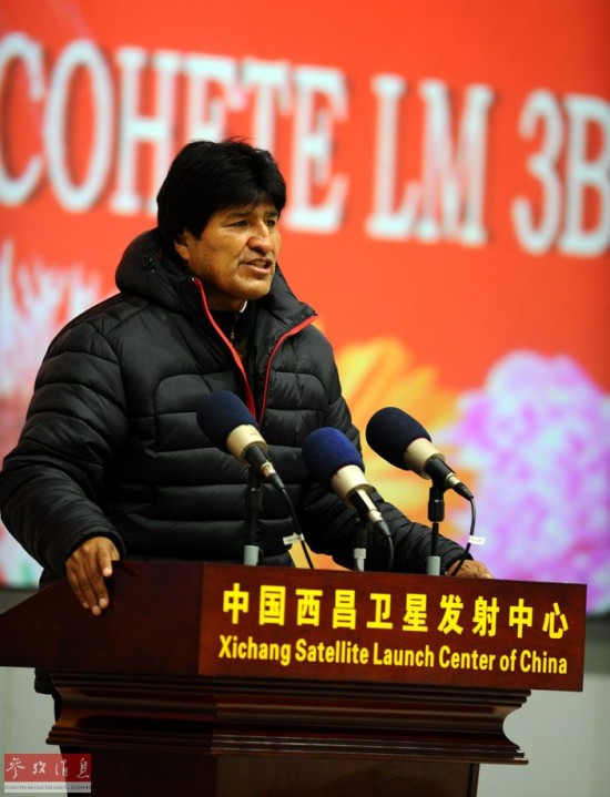 12月21日,卫星发射成功后,玻利维亚总统莫拉莱斯在西昌卫星发射中心发表讲话。当日零时42分,我国在西昌卫星发射中心用长征三号乙运载火箭,成功将玻利维亚通信卫星发射升空,卫星顺利进入预定轨道。玻利维亚通信卫星是玻利维亚拥有的第一颗卫星。玻利维亚总统莫拉莱斯专程来到西昌卫星发射中心,现场观看了卫星发射。这是外国国家元首首次到中国航天发射场观看卫星发射。新华社记者 燕雁 摄