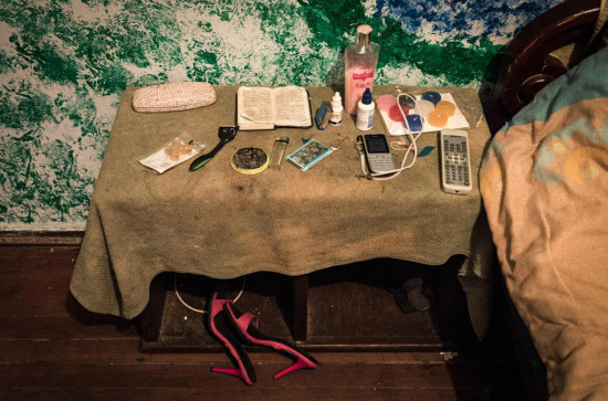 但并不是每一个卖淫的人都有足够的钱做变性手术,所以她们中的许多人依靠激素药物来让自己看起来更像女性。Arelis甚至都没有钱买这些药物,所以他只有在她的文胸里垫上袜子,这样外观上看起来才更像女性。图为Arelis起床前点燃一支烟。