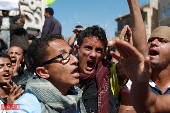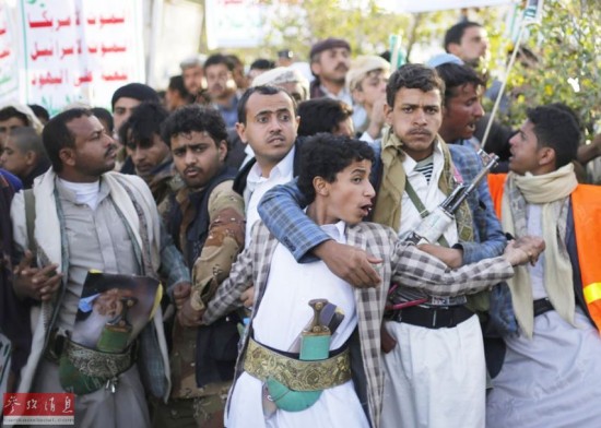 当然,对胡塞武装不满者也大有人在。图为2015年1月23日,一群反对胡塞武装占据首都的示威者在呼喊口号。