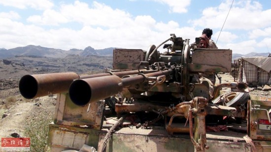 2015年3月22日,在亚丁东边的南部省份拉赫季,一名忠于也门现总统哈迪的民兵正在操控一门双管防空炮。