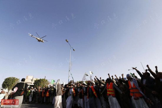 2015年1月23日,也门首都萨那,一架军用直升机在一群胡塞武装支持者的头顶悬停。