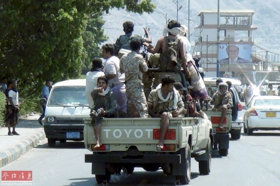 2015年3月25日,忠于也门现总统哈迪的武装民兵乘车在南方港口城市亚丁巡逻,其中一人还用手指着拍摄者,可能是在发出警告。