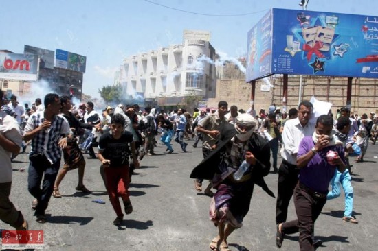图为2015年3月22日,也门西南部城市塔伊兹,反对胡塞武装的示威人群被前者发射的催泪瓦斯驱散。