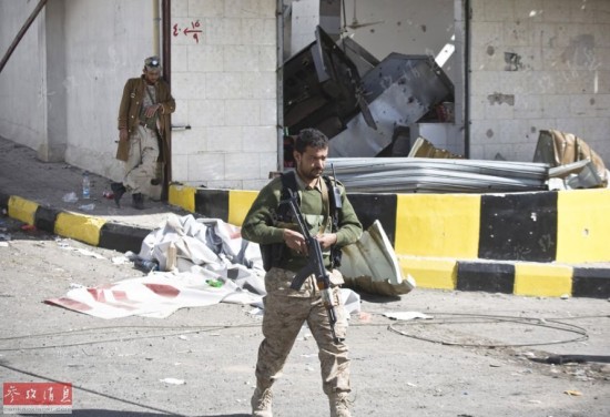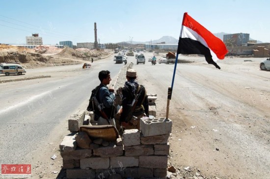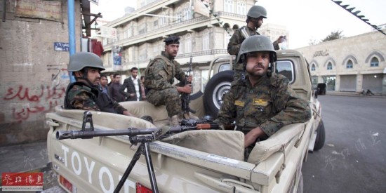 2015年1月20日,进驻首都萨那的胡塞武装人员在一条通往总统府的交通干道上警戒。