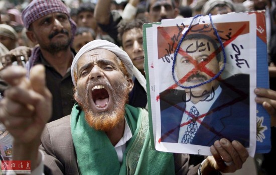 遭到内外夹攻的胡塞武装,原本处境不利。孰料2011年初也门首都爆发了大规模反政府示威活动,萨利赫政权因此无暇顾及胡塞武装,这就给了后者喘息之机。图为2011年3月30日也门首都萨那,当地民众举着反对萨利赫的画像示威游行。