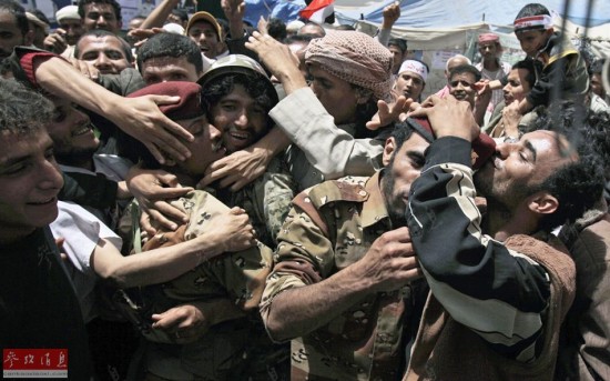 随着反对派力量增强,萨利赫逐渐众叛亲离,并因被反对派炮火炸伤而一度离开也门境内,其对国内局势的掌控进一步弱化。图为2011年3月31日,也门首都萨那,反对萨利赫政权的民众在拥抱和亲吻叛逃过来的前政府军士兵。