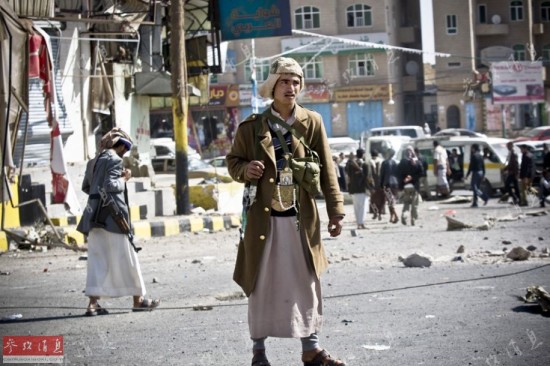 资料图片:胡塞武装人员在萨那街头持枪抗议沙特等国的空袭行动。