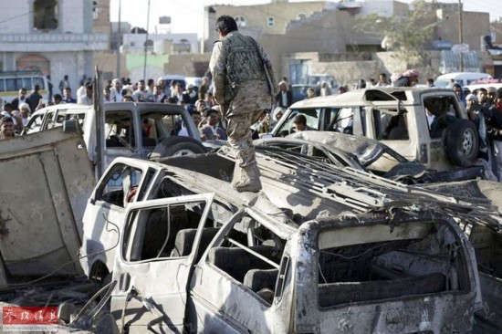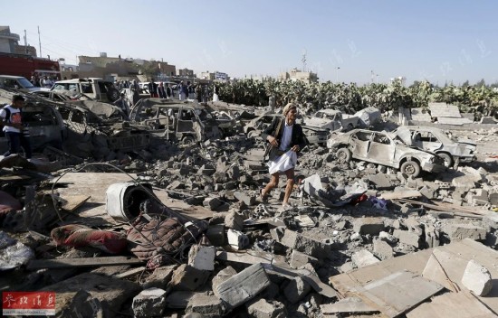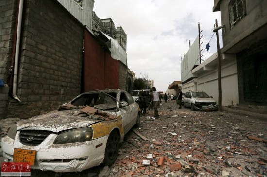 但不幸的是,26日的空袭行动误炸了一处平民区,造成至少75人死伤。图为2015年3月26日,也门首都萨那,大批民用车辆在空袭中变成废铁。