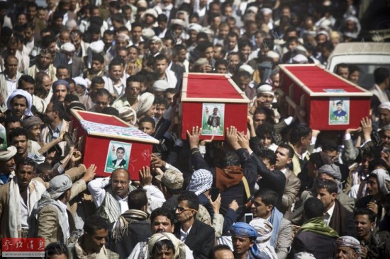 2015年1月23日,也门首都萨那,大批胡塞武装人员抬着阵亡同伴的棺材举行葬礼,后者在与总统卫队的交火中阵亡。