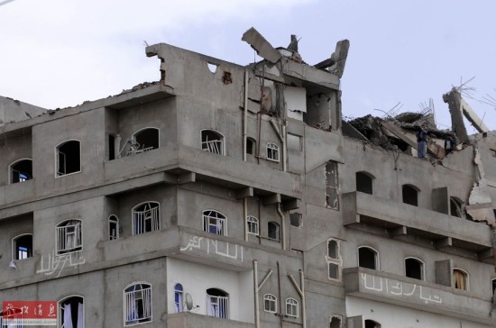 这是4月8日在也门首都萨那拍摄的空袭中被炸毁的楼房。沙特等国8日中午首次对也门首都萨那北部的胡塞武装组织人员聚集区展开空袭,导致3人死亡,数十人受伤。也门卫生部发表声明说,沙特等国对也门的空袭总共已经导致至少160人死亡,500多人受伤。新华社发(汉尼·阿里摄)