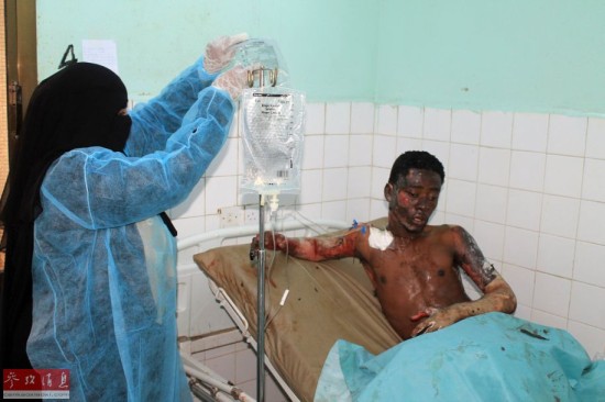 当地时间2015年3月28日,也门亚丁,也门军方一个军械库发生爆炸,致浓烟滚滚。图为受伤者。