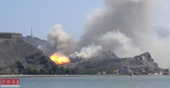 当地时间2015年3月28日,也门亚丁,也门军方一个军械库发生爆炸,致浓烟滚滚。