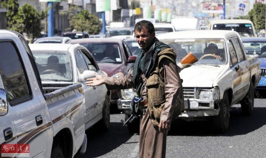 控制了首都和北部大片地区的胡塞武装,很快开始“行使权力”。图为在萨那街头指挥交通的胡塞武装人员。