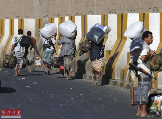 2015年1月19日也门胡塞反政府武装与总统卫队在首都萨那总统府附近激战,造成近百人死伤,随后于20日占领总统府。图为2015年1月,原也门总统卫队的士兵被迫脱下军装,换上平民的衣服,带着自己的随身武器和私人物品离开总统官邸。