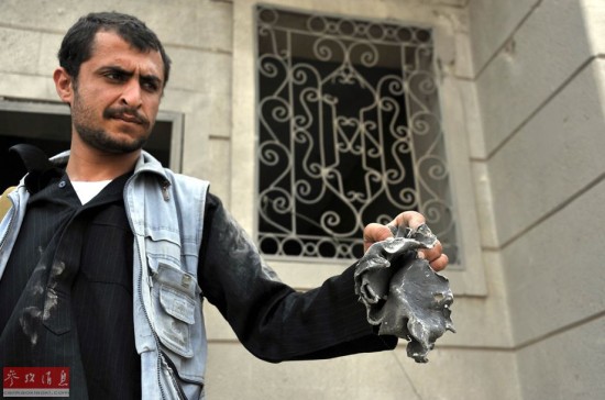 4月8日,在也门首都萨那,一名男子展示炮弹碎片。沙特等国8日中午首次对也门首都萨那北部的胡塞武装组织人员聚集区展开空袭,导致3人死亡,数十人受伤。也门卫生部发表声明说,沙特等国对也门的空袭总共已经导致至少160人死亡,500多人受伤。新华社发(汉尼·阿里摄)