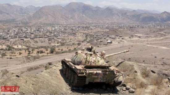 2015年3月22日,也门南部拉赫季省,一辆隶属忠于也门总统哈迪的民兵的坦克据守山顶,监视着山下一条交通干线的一举一动。
