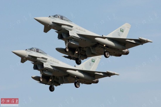 在2007和2008年的2次短暂停火后,胡塞武装与也门政府军重启战端。2009年11月6日,沙特政府高调宣布,胡塞叛乱武装进入沙特境内袭击目标,造成沙特士兵死亡。 于是,沙特开始越境打击胡塞叛乱武装。沙特外交官称,“台风”和F-15战机轰炸了胡塞叛乱武装的巢穴。此后,沙特陆军和特种部队开赴也门北部,协助也门军队打击胡塞叛乱武装。英国媒体指出,也门政府与胡塞武装之间的战争,实际上是沙特和伊朗之间的一场“代理人战争”。图为沙特空军EF-2000“台风”双机编队。