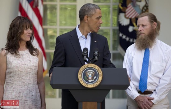 5月31日,美国总统奥巴马(中)与被阿富汗塔利班俘虏的唯一一名美军士兵鲍·伯格达尔的父亲鲍勃和母亲贾妮在华盛顿白宫出席新闻发布会。新华社/美联