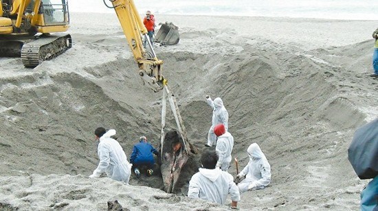 去年五月搁浅在宜兰县南方澳内埤海滩的抹香鲸就地掩埋。图自台湾《联合报》