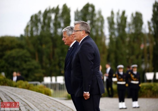 9月1日,波兰总统科莫罗夫斯基(右)和德国总统高克在波兰港口格但斯克举行的纪念二战爆发75周年仪式上敬献花圈。