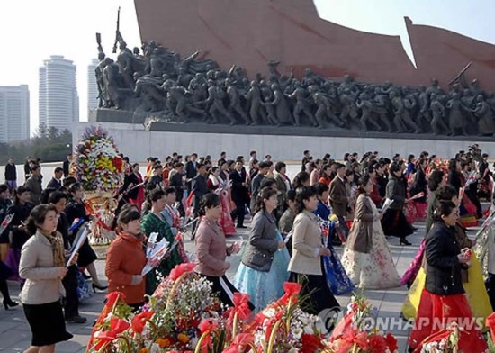 国际在线专稿:4月9日是朝鲜已故最高领导人金正日出任朝鲜国防委员会委员长22周年的纪念日。据朝鲜中央通讯社报道,9日当天,平壤市民和青年学生在平壤体育馆、凯旋门广场等地举行了盛大的舞会和献花活动。