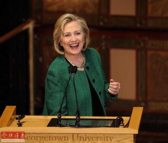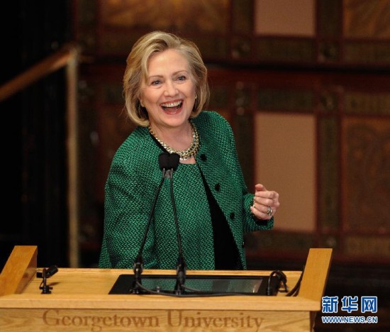 美国前国务卿、民主党人希拉里·克林顿4月12日正式宣布参加2016年美国总统大选。这是2014年10月30日拍摄的希拉里·克林顿在美国首都华盛顿的乔治敦大学发表演讲的资料照片。 新华社记者鲍丹丹摄