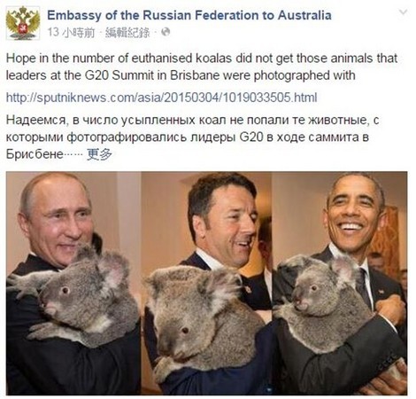 俄使馆在脸书发文,希望G20峰会时“抱过的”考拉们平安。(图片来源于网络)