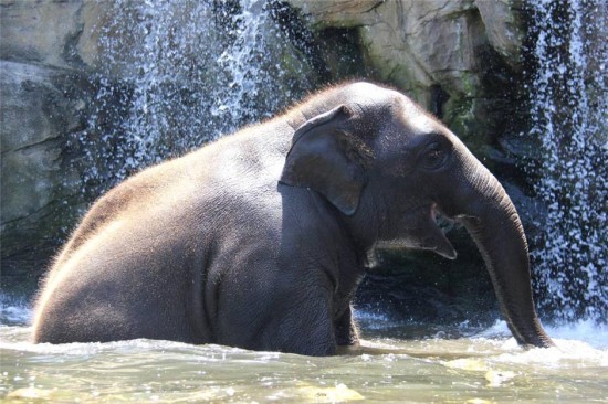 热得受不了的小象与妈妈跳进动物园的水池中,享受清凉。