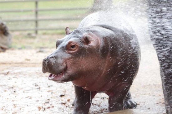 由于天气太热,动物园安排小河马早晨吃饭前要洗个澡降温。