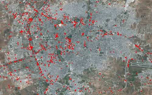 资料图:卫星图中的红点为2013年交战双方在叙利亚阿勒颇设置的路障,总计1100多处。(图片来源于网络)